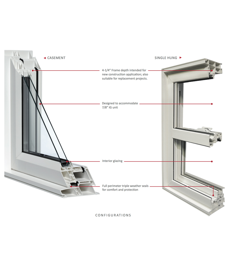- 4-1/4” Frame depth with wood return channel design, intended for new construction application and replacement projects.